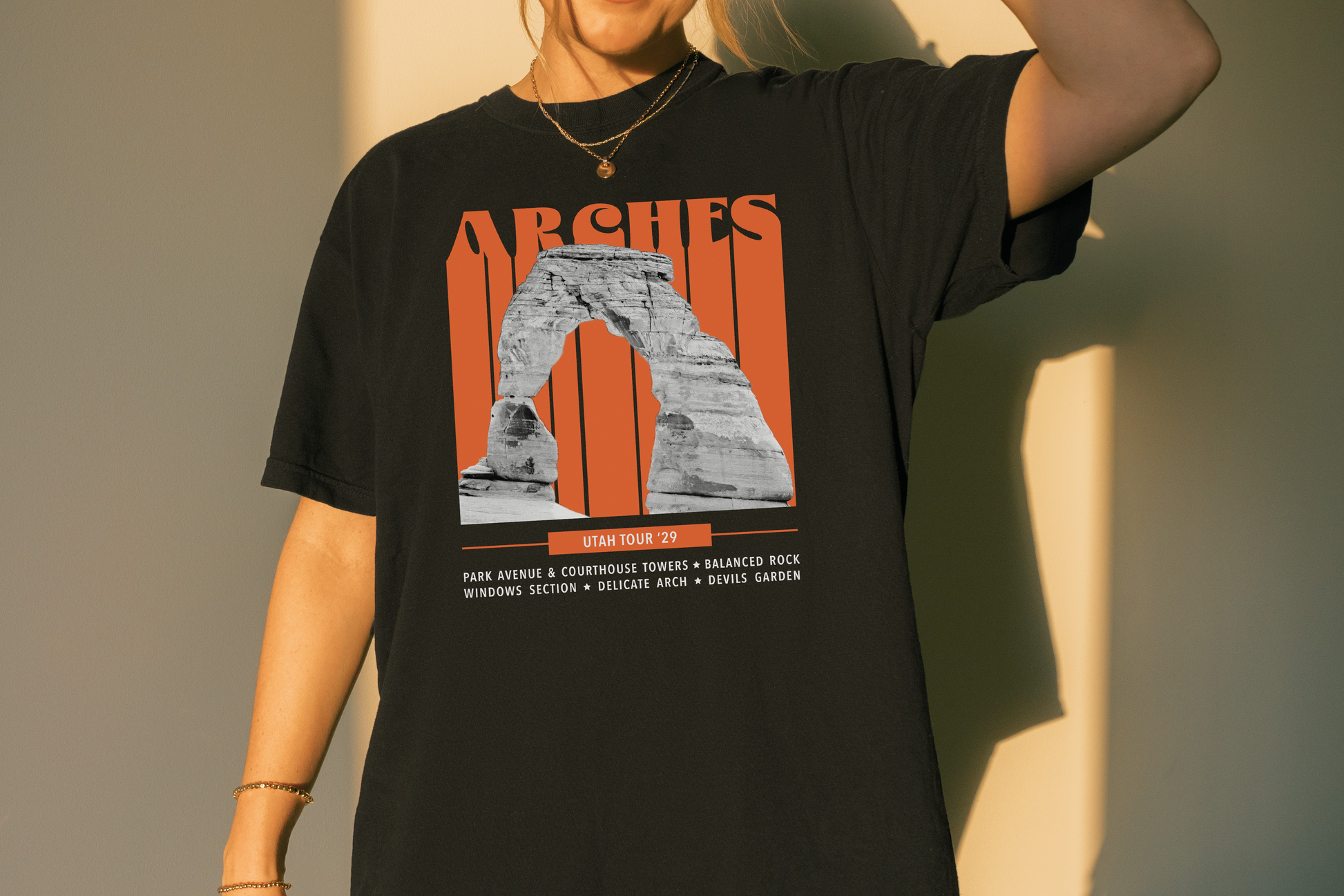 Inspired by classic 70's band tour shirts, this band themed national park shirt celebrates Arches National Park.