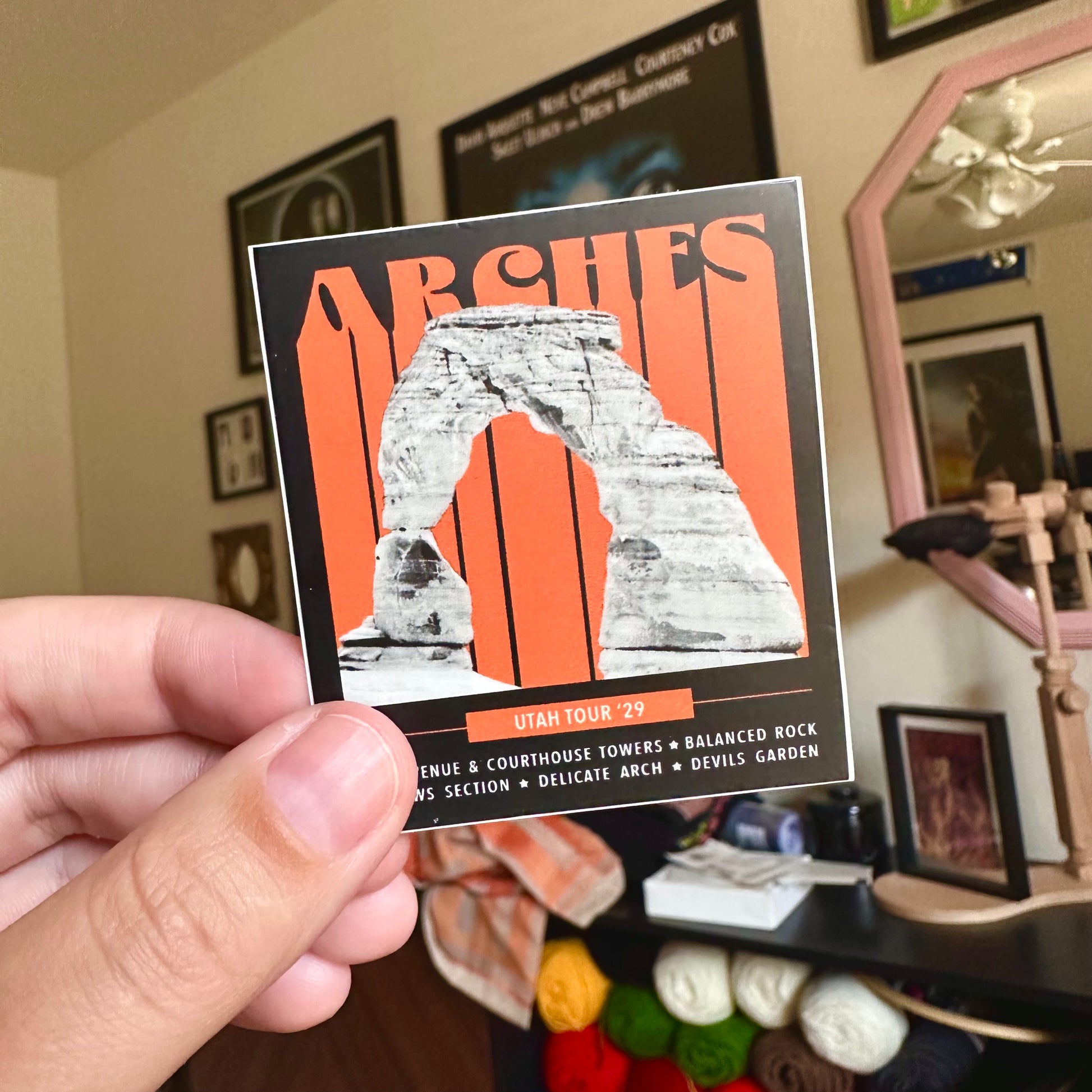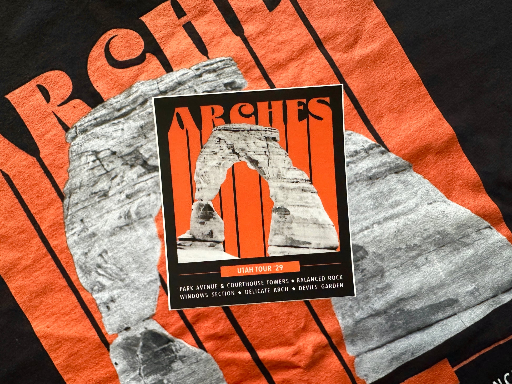 Inspired by classic rock band tour shirts, this design celebrates Arches National Park.