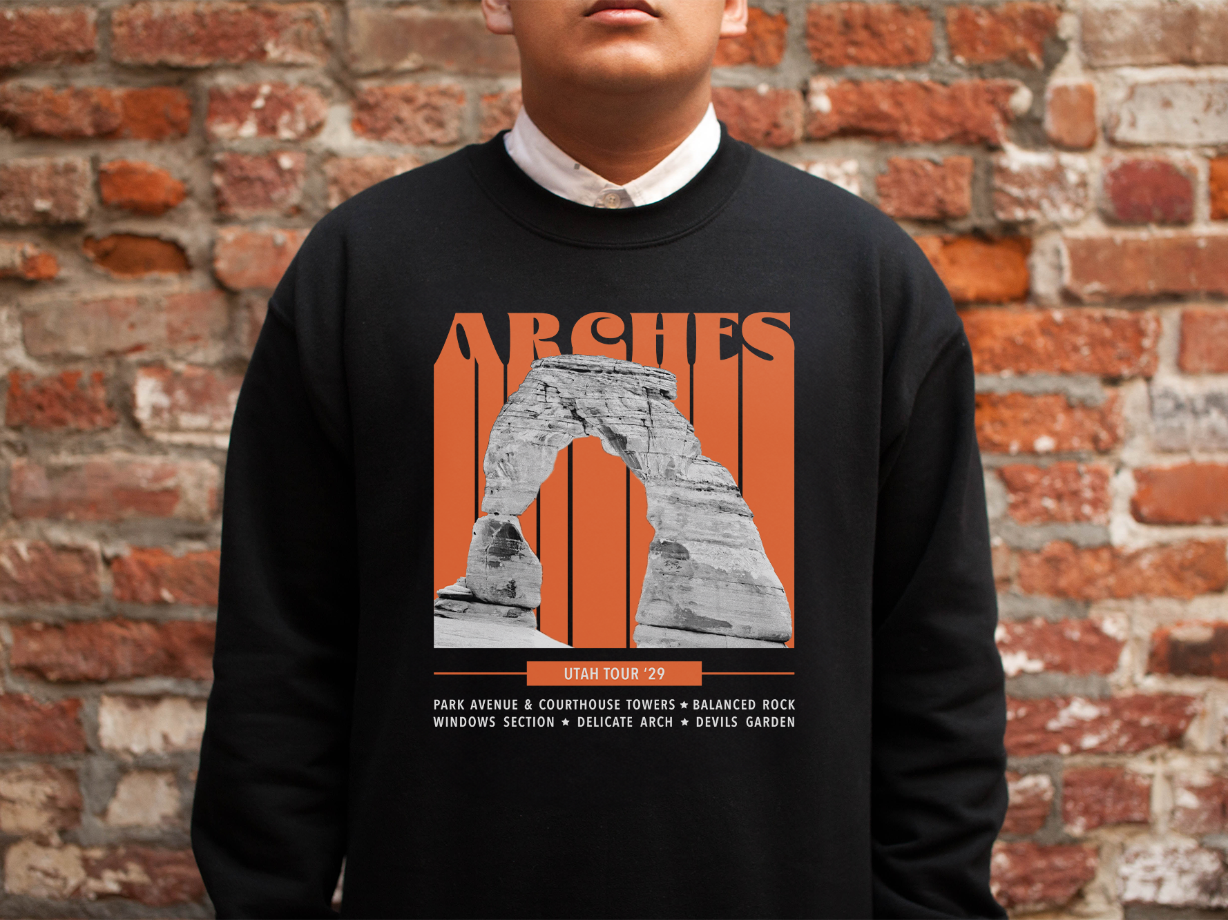 Inspired by classic rock band tour shirts, this national parks themed band crewneck celebrates the grandeur of Arches National Park.