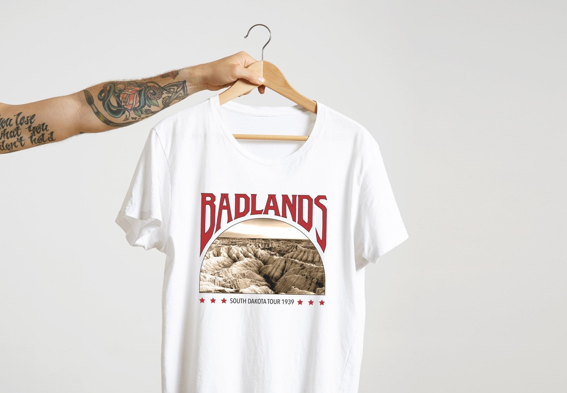 Inspired by classic rock band tour shirts, this national park themed band shirt celebrates the grandeur of Badlands National Park.