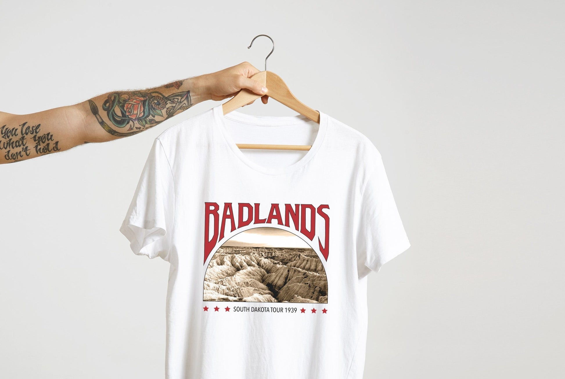 Inspired by classic rock band tour shirts, this national park themed band shirt celebrates the grandeur of Badlands National Park.