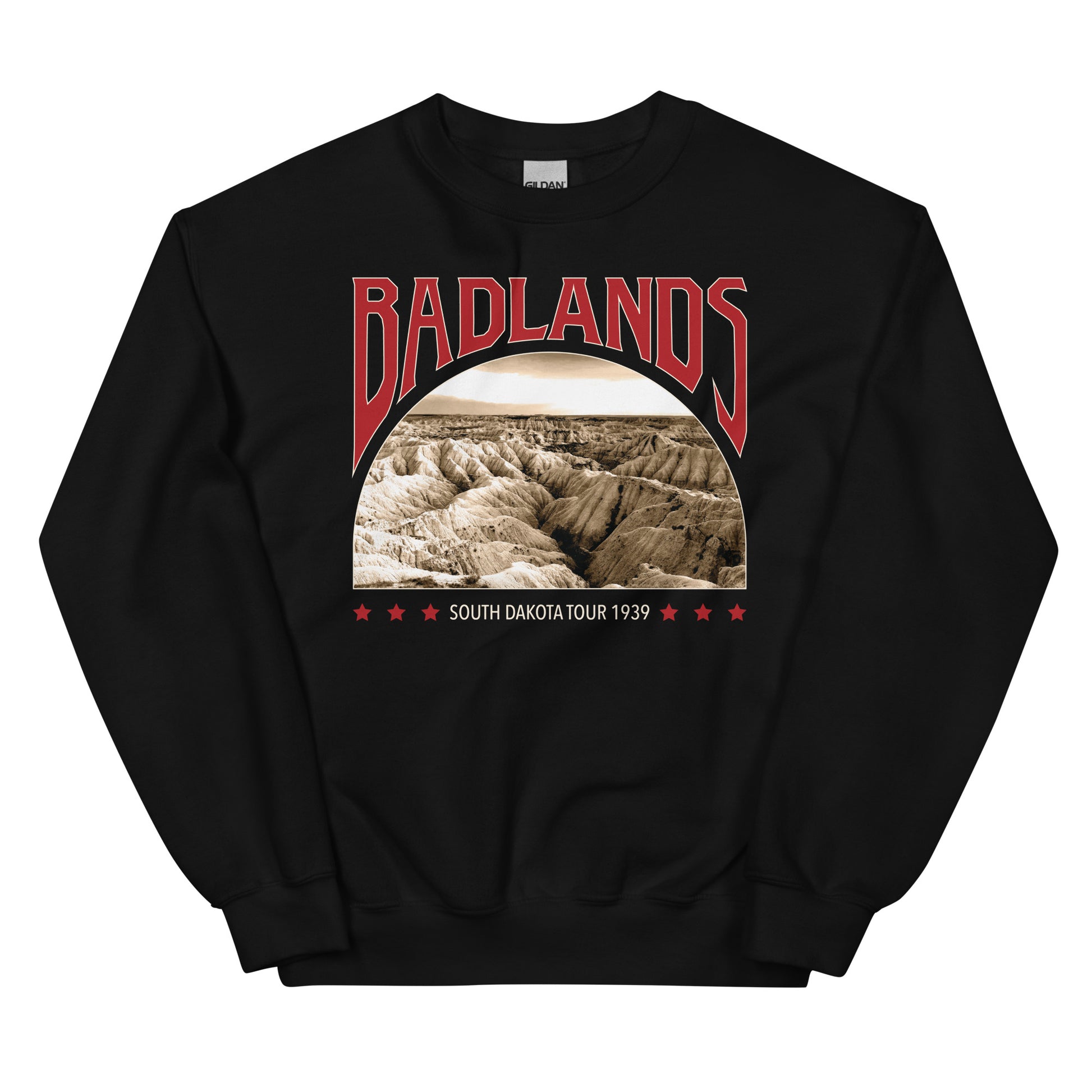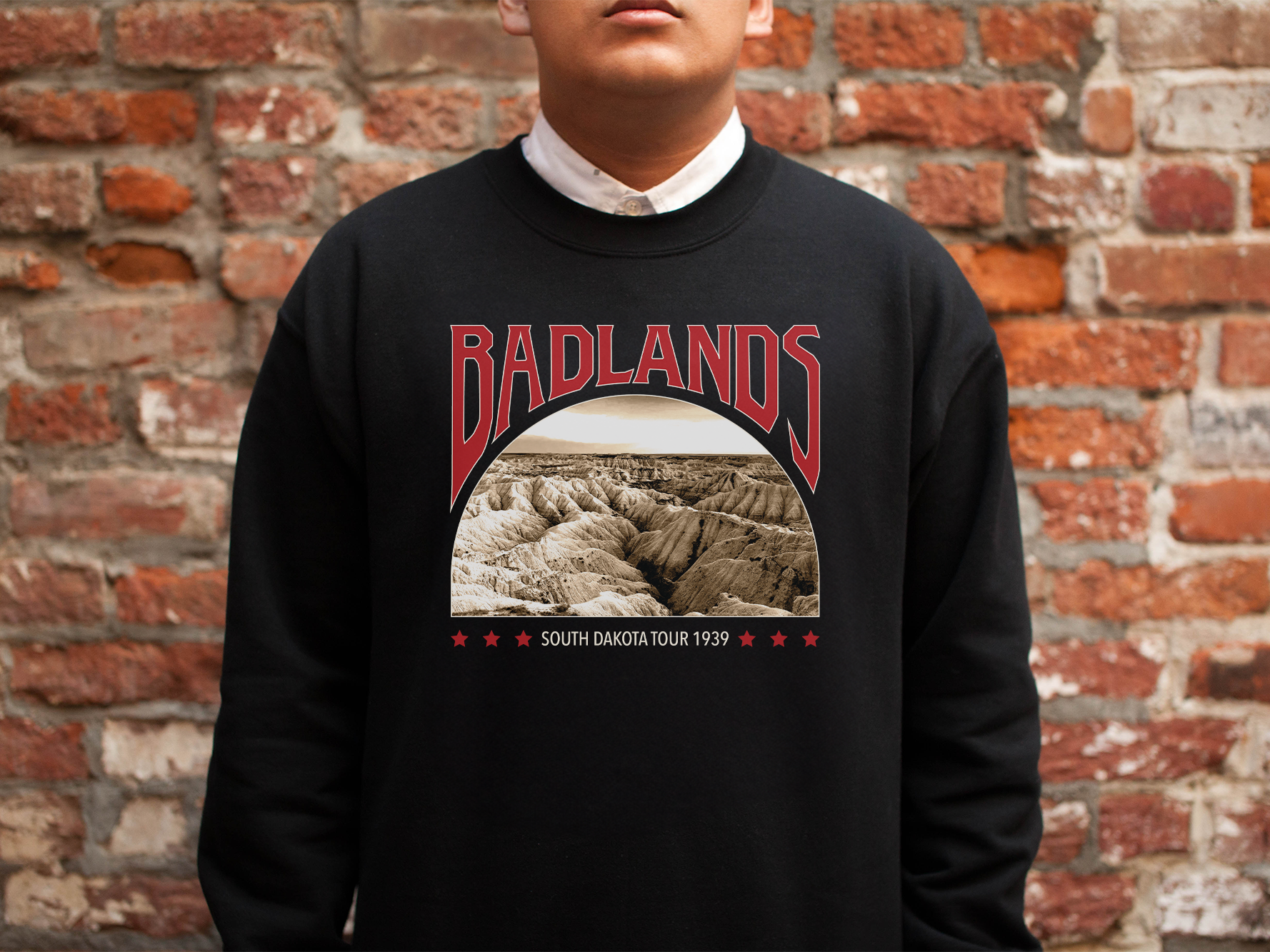 Inspired by classic rock band tour shirts, this national parks themed band crewneck celebrates the grandeur of Badlands National Park.
