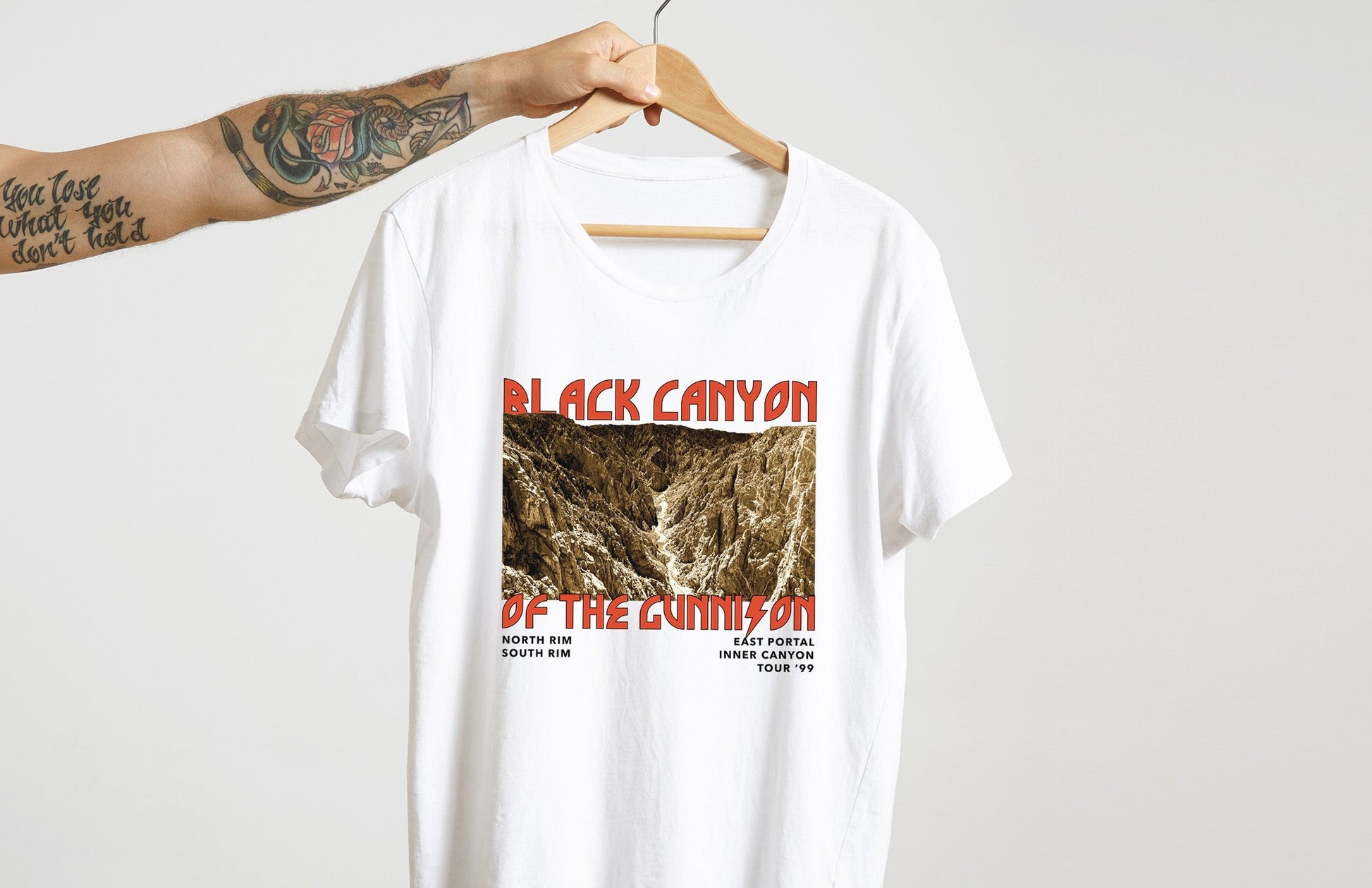 Inspired by classic 80's rock band tour shirts, this national park themed band shirt celebrates Black Canyon of the Gunnison National Park.