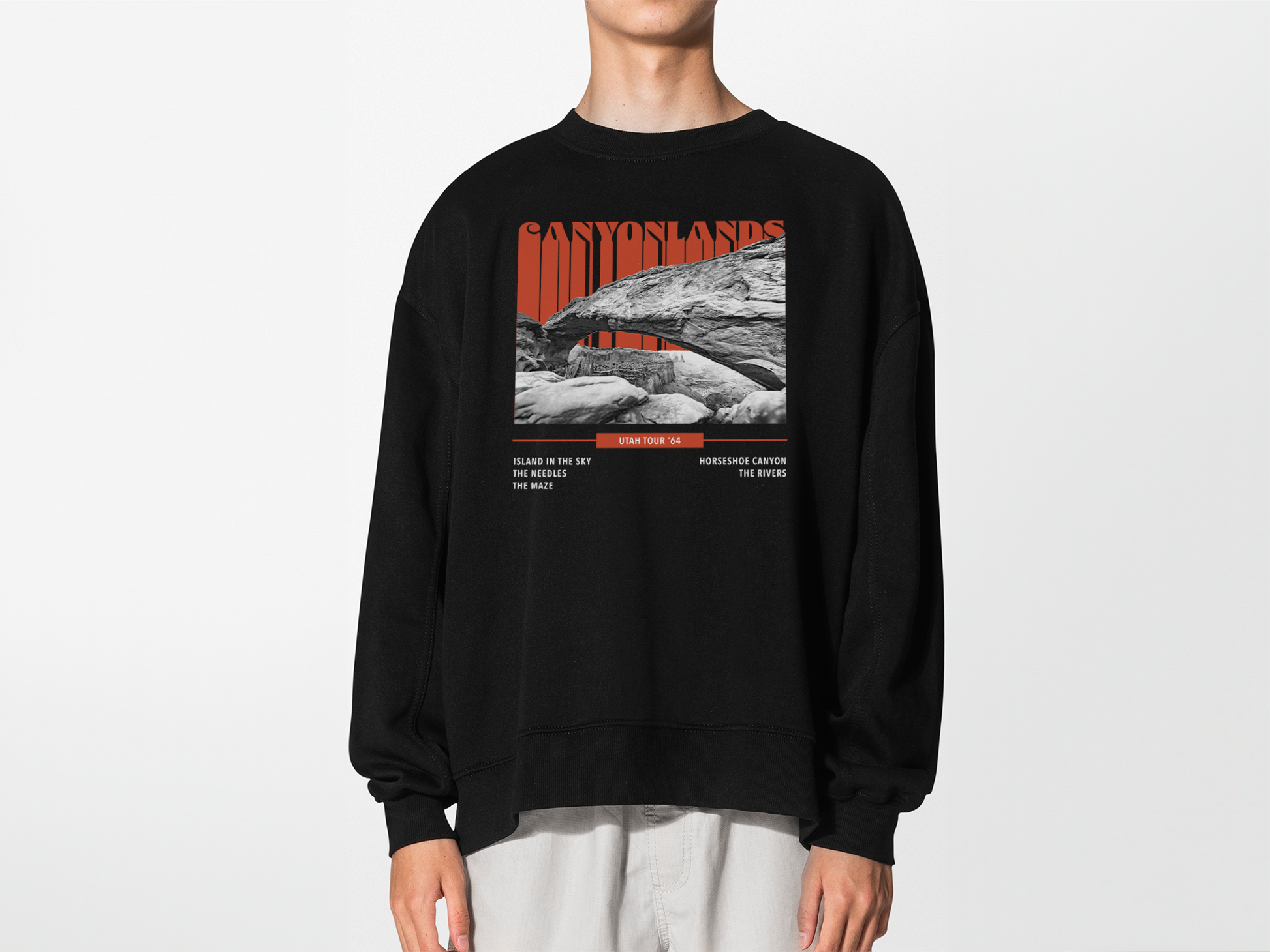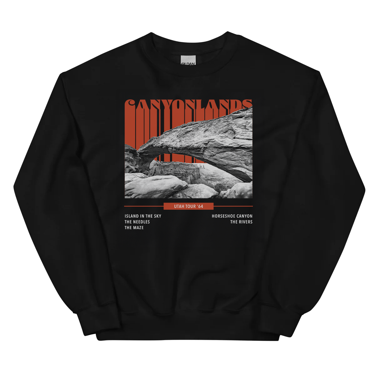 Inspired by classic rock band tour shirts, this national parks themed band crewneck celebrates the grandeur of Canyonlands National Park.
