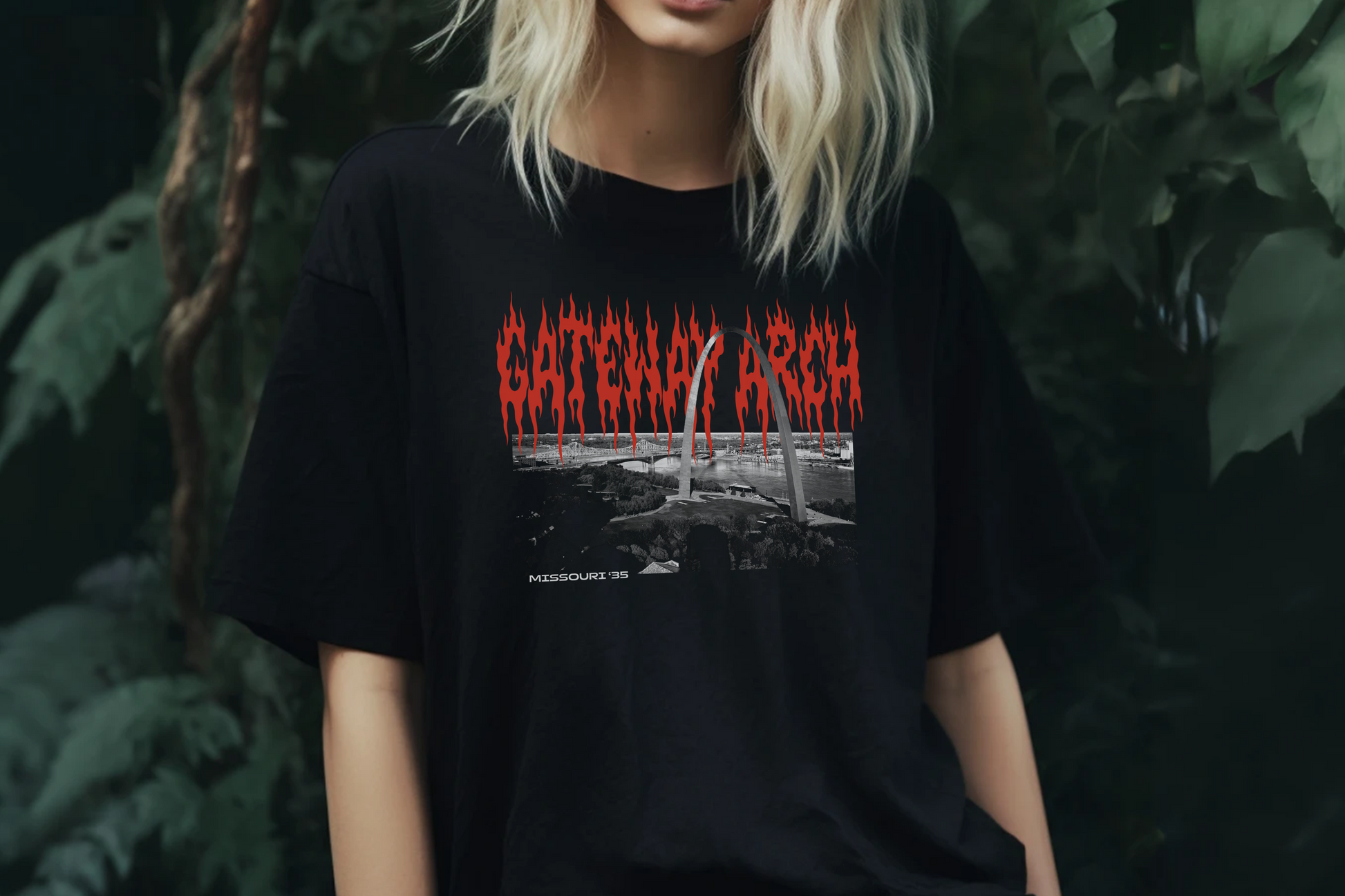 Inspired by classic band tour shirts, this band themed national park shirt celebrates Gateway Arch National Park.