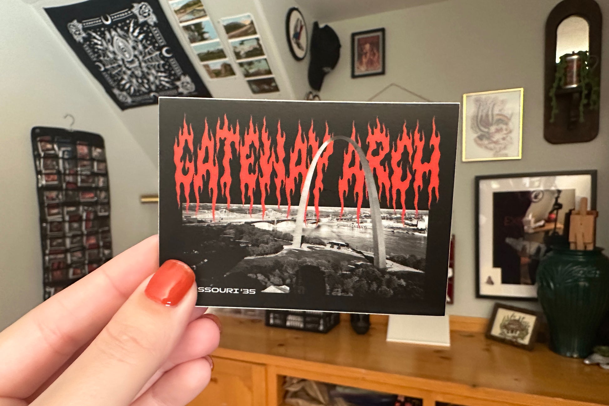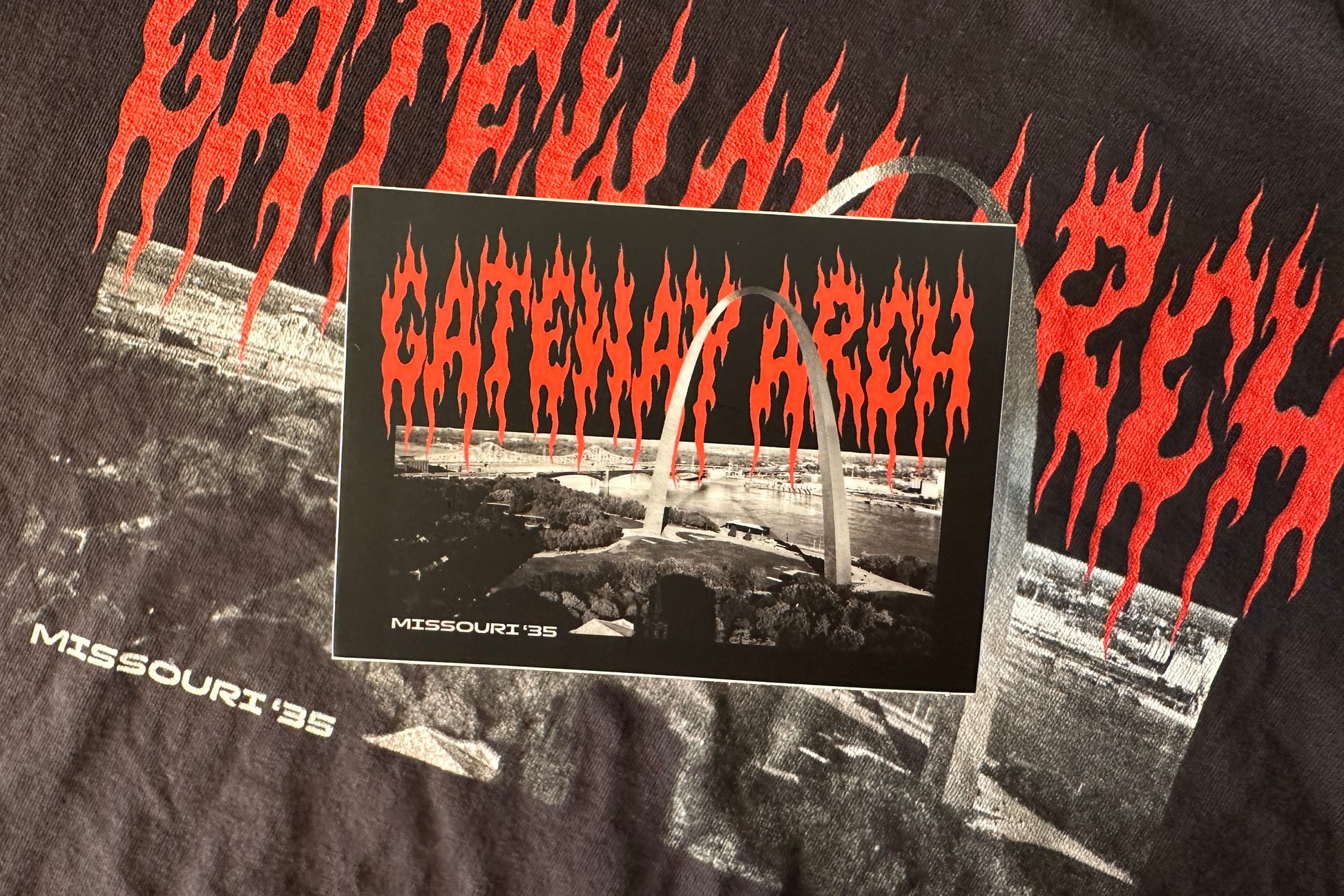 Inspired by classic rock band tour shirts, this design celebrates Gateway Arch National Park.
