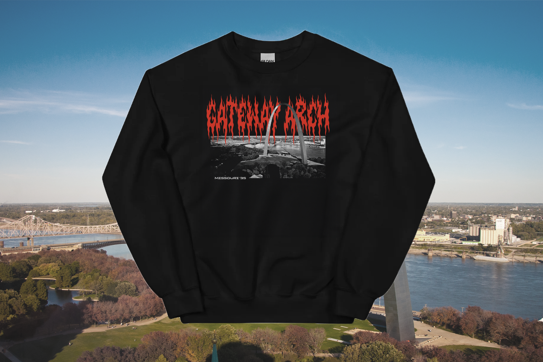 Inspired by classic band tour shirts, this national parks themed crewneck celebrates Gateway Arch National Park.