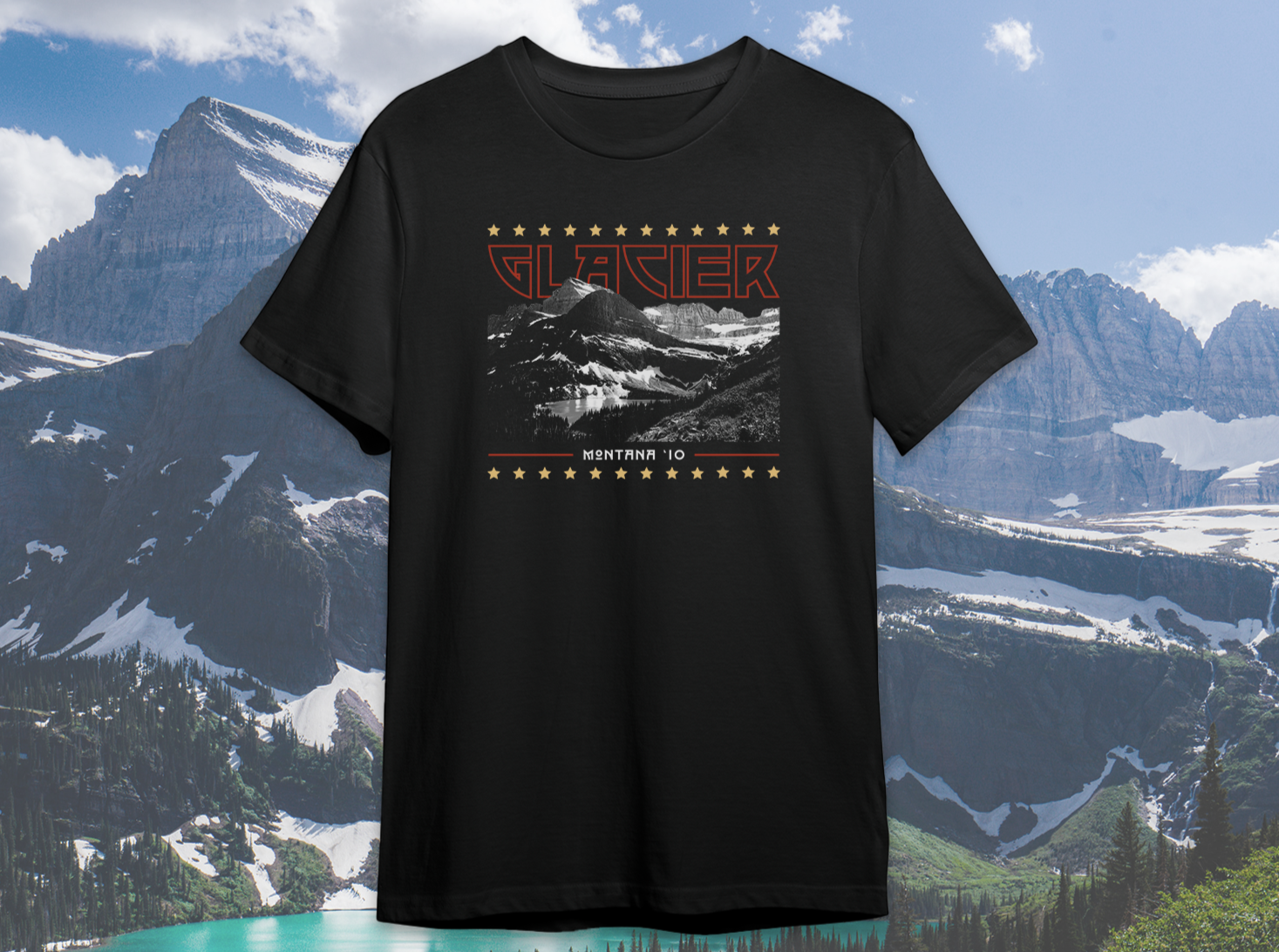 Inspired by classic rock band tour shirts, this national park themed band shirt celebrates the grandeur of Glacier National Park.