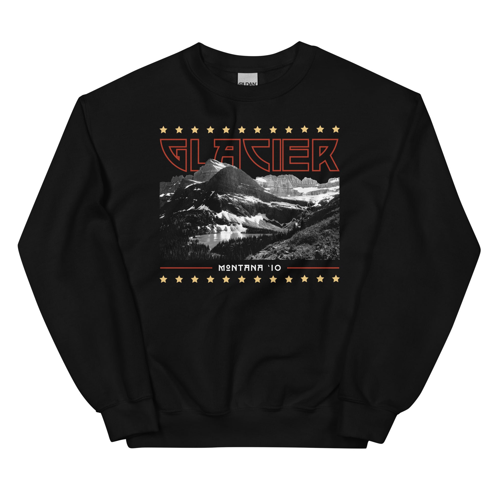 Inspired by classic rock band tour shirts, this national parks themed band crewneck celebrates the grandeur of Glacier National Park.