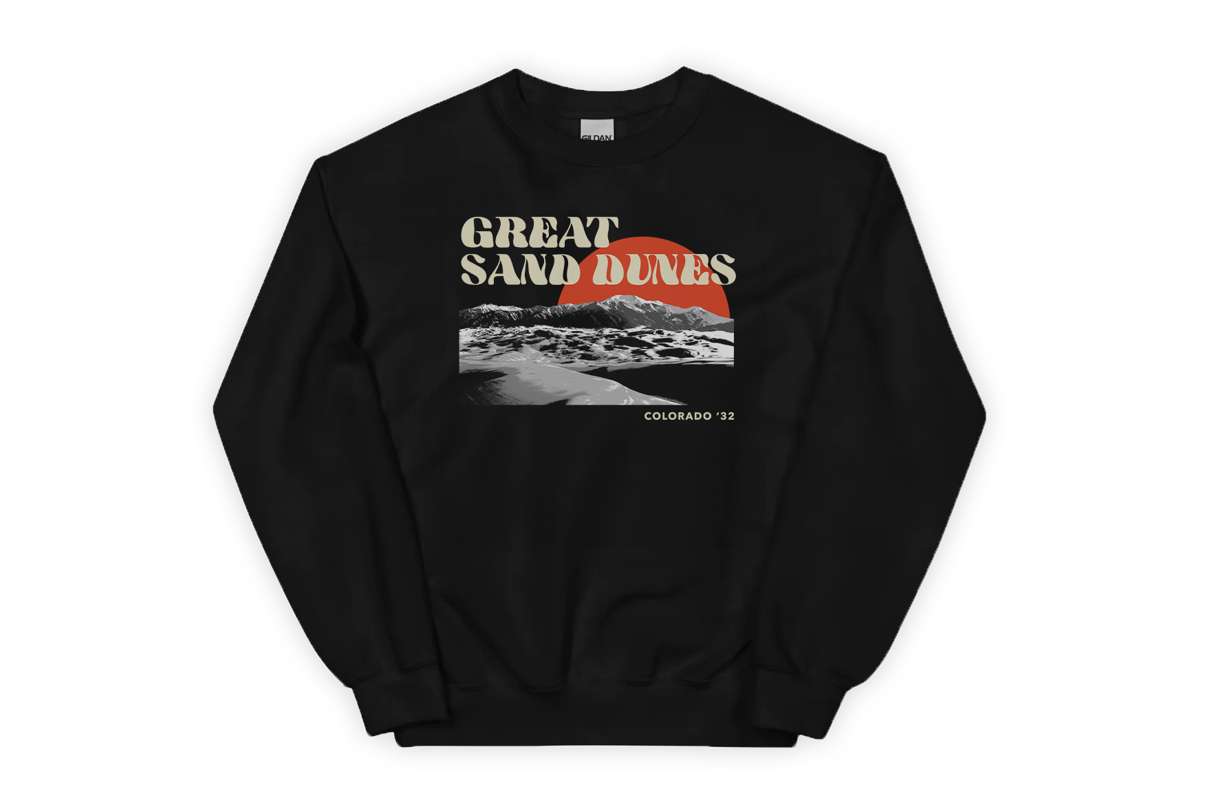 Inspired by classic band tour shirts, this national parks themed crewneck celebrates Great Sand Dunes National Park.