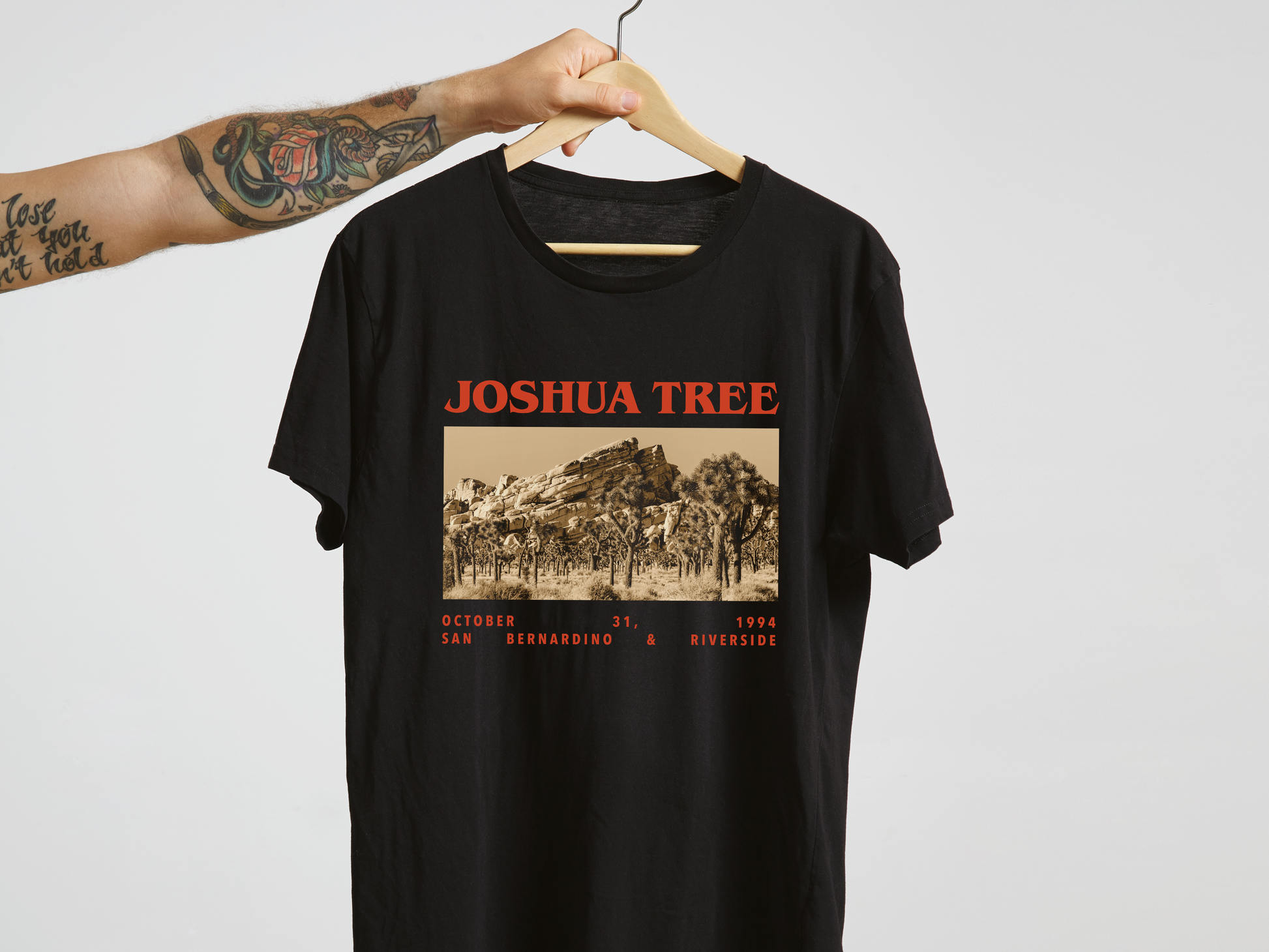 Inspired by classic rock band tour shirts, this national park themed band shirt celebrates the grandeur of Joshua Tree National Park.