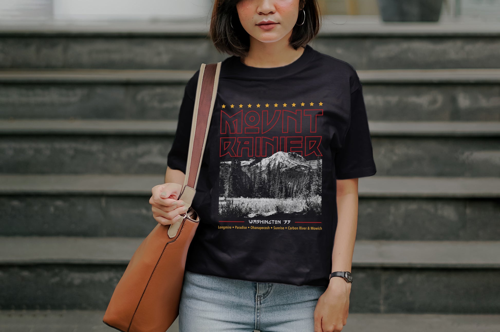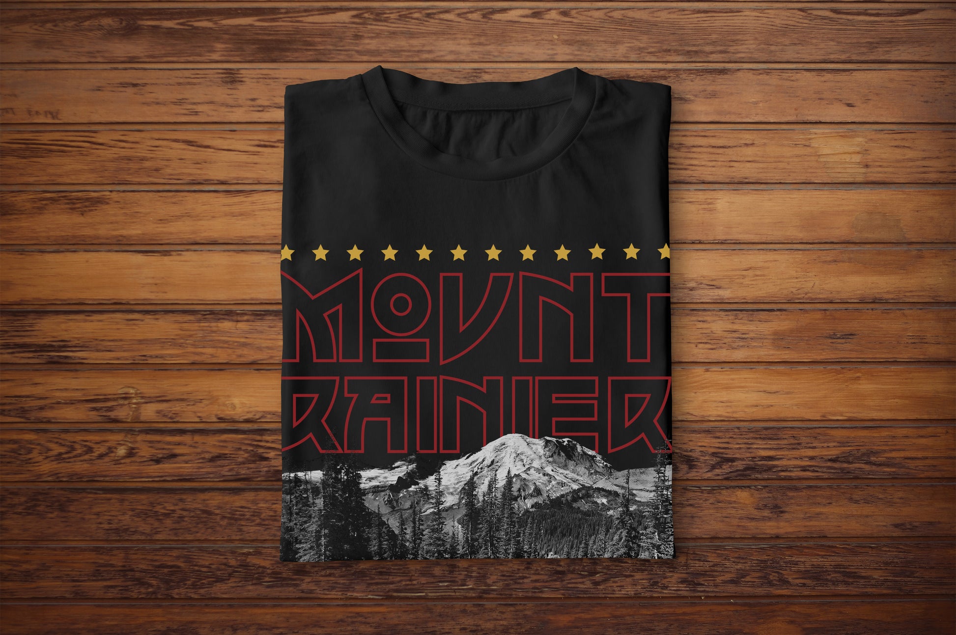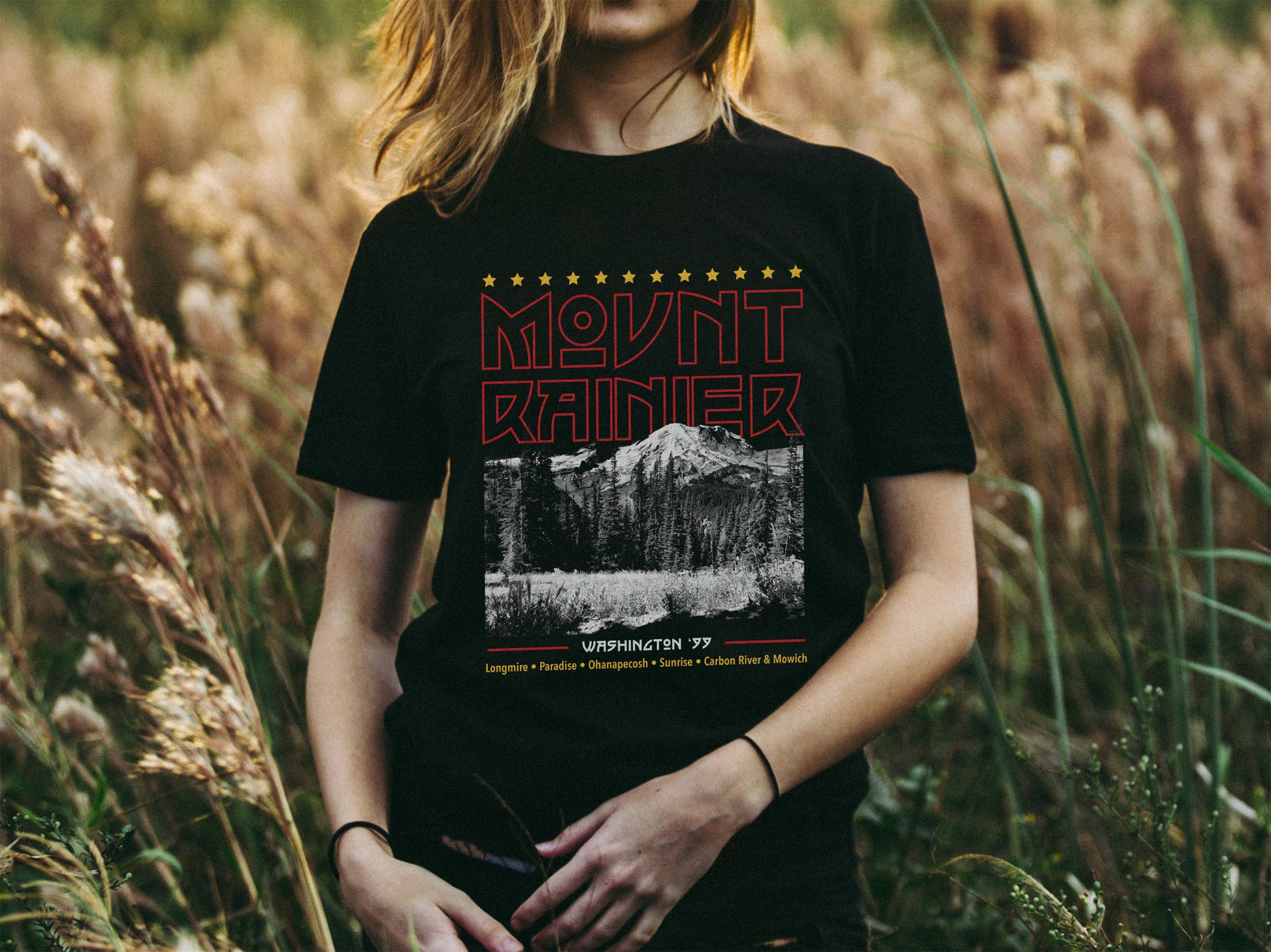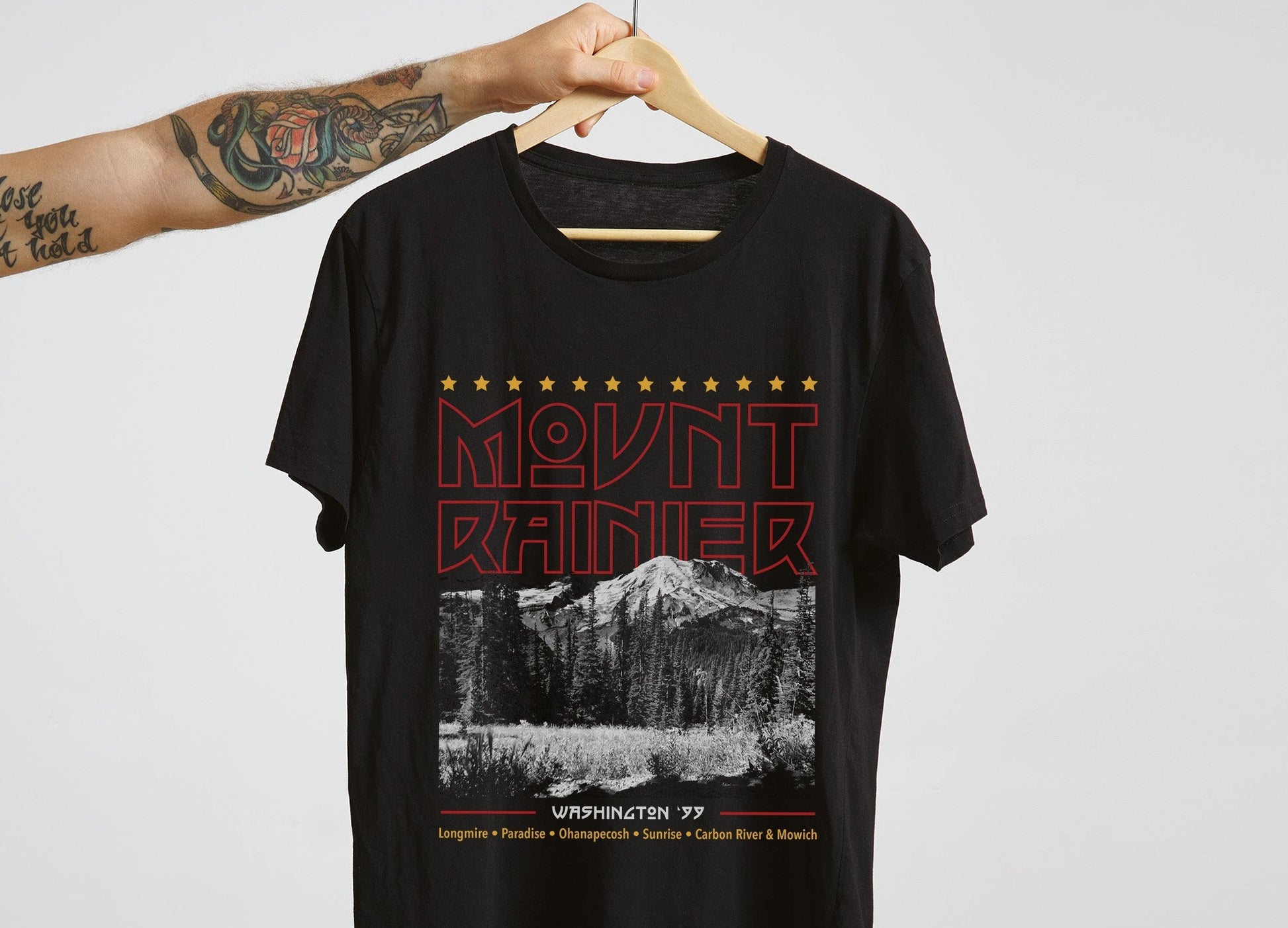 Inspired by classic 80's rock band tour shirts, this national park themed band shirt celebrates Mount Rainier National Park.