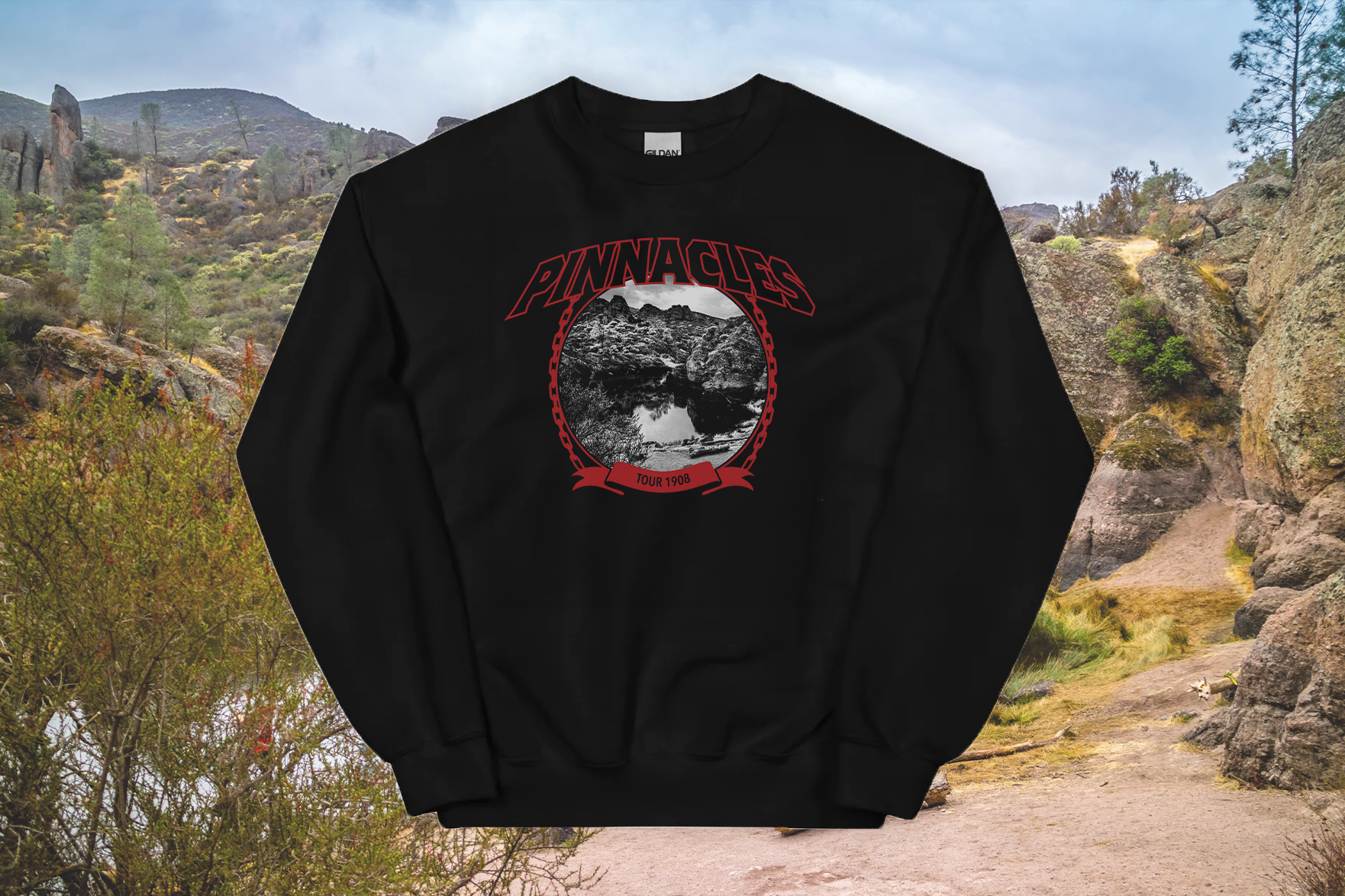 Inspired by classic rock band tour shirts, this crewneck celebrates Pinnacles National Park.