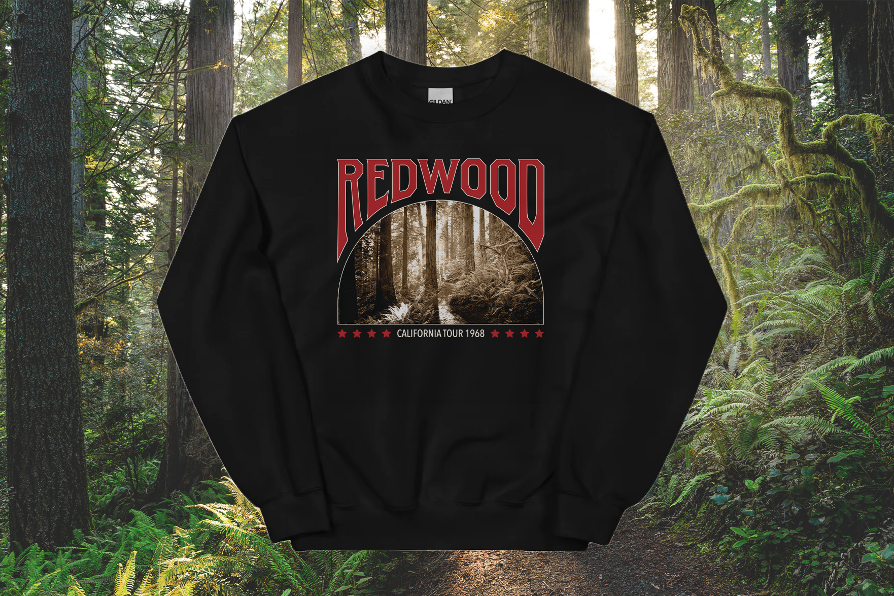 Inspired by classic rock band tour shirts, this crewneck celebrates Redwood National Park.