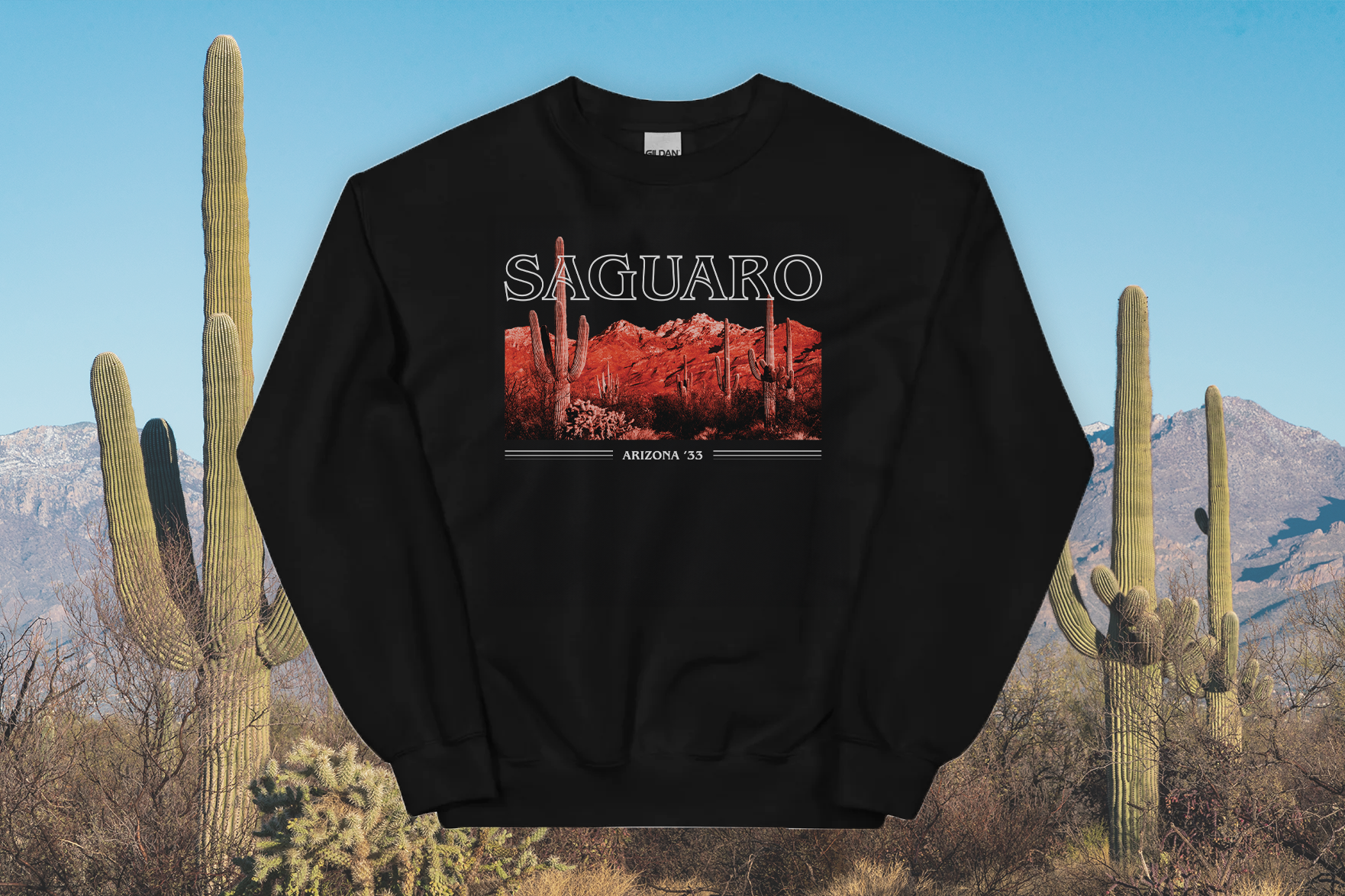 Inspired by classic rock band tour shirts, this crewneck celebrates the grandeur of Saguaro National Park.