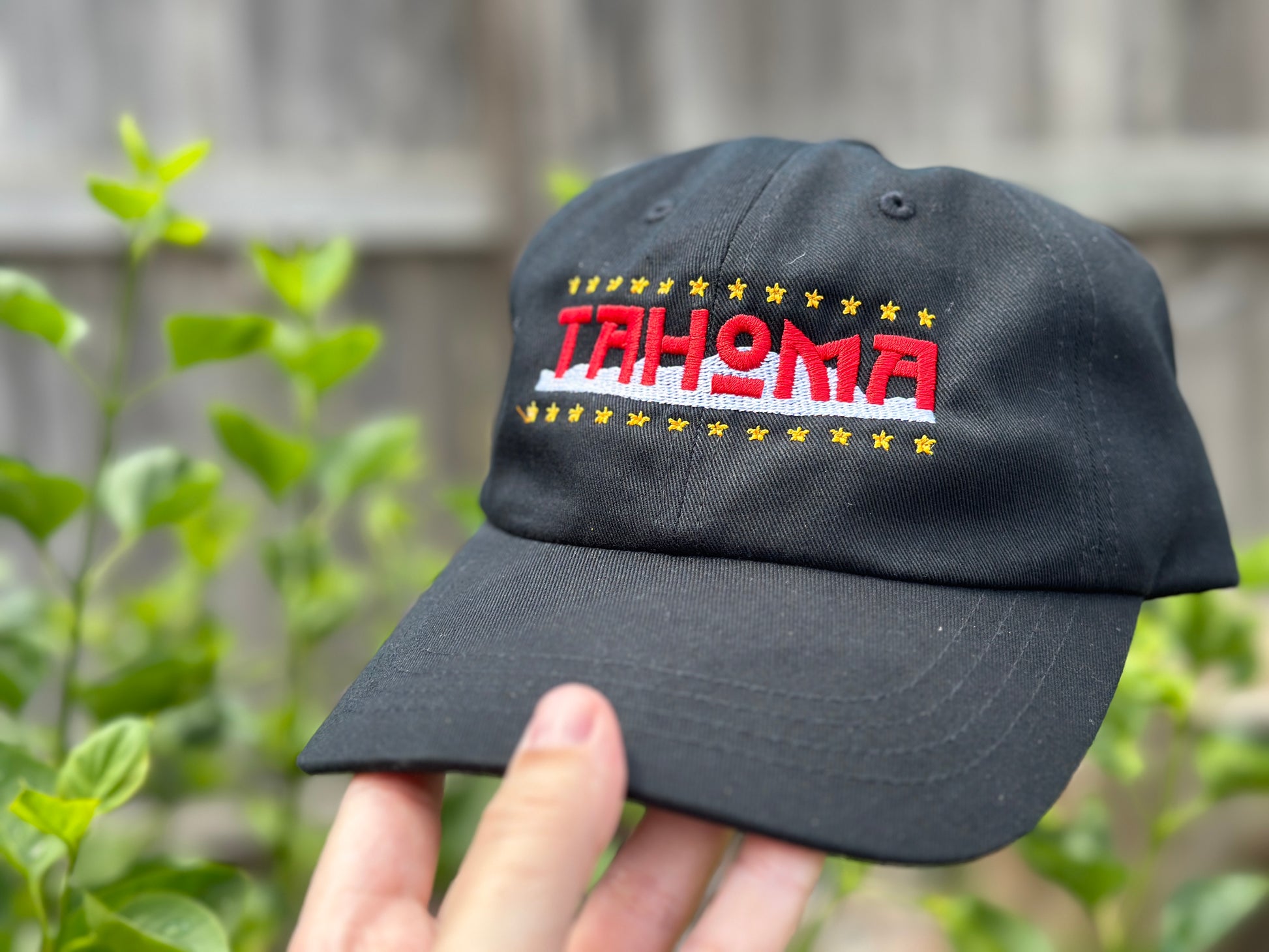 Inspired by classic band merch, this black Tahoma Dad Hat is for the for emo kids turned granola adults.