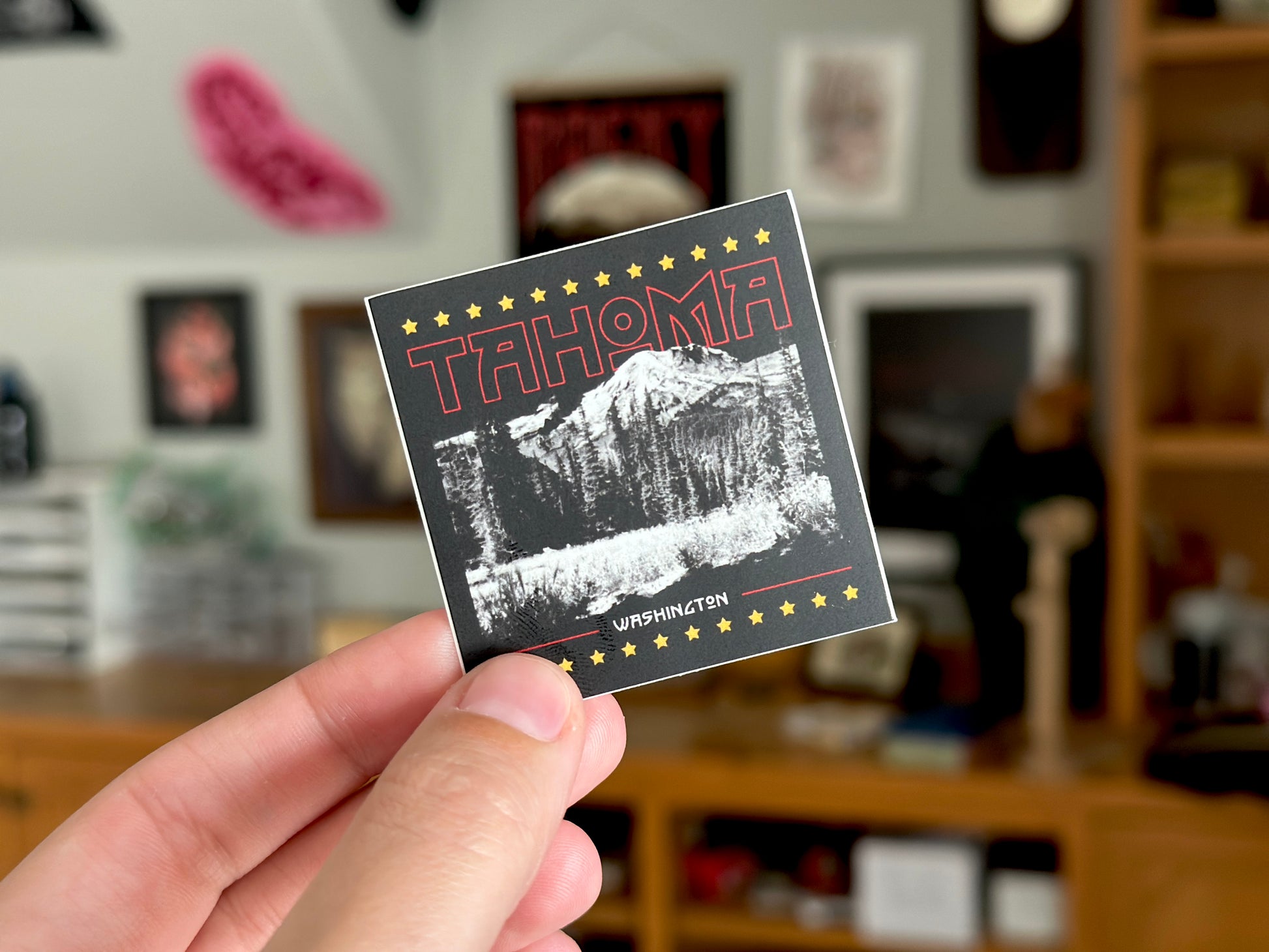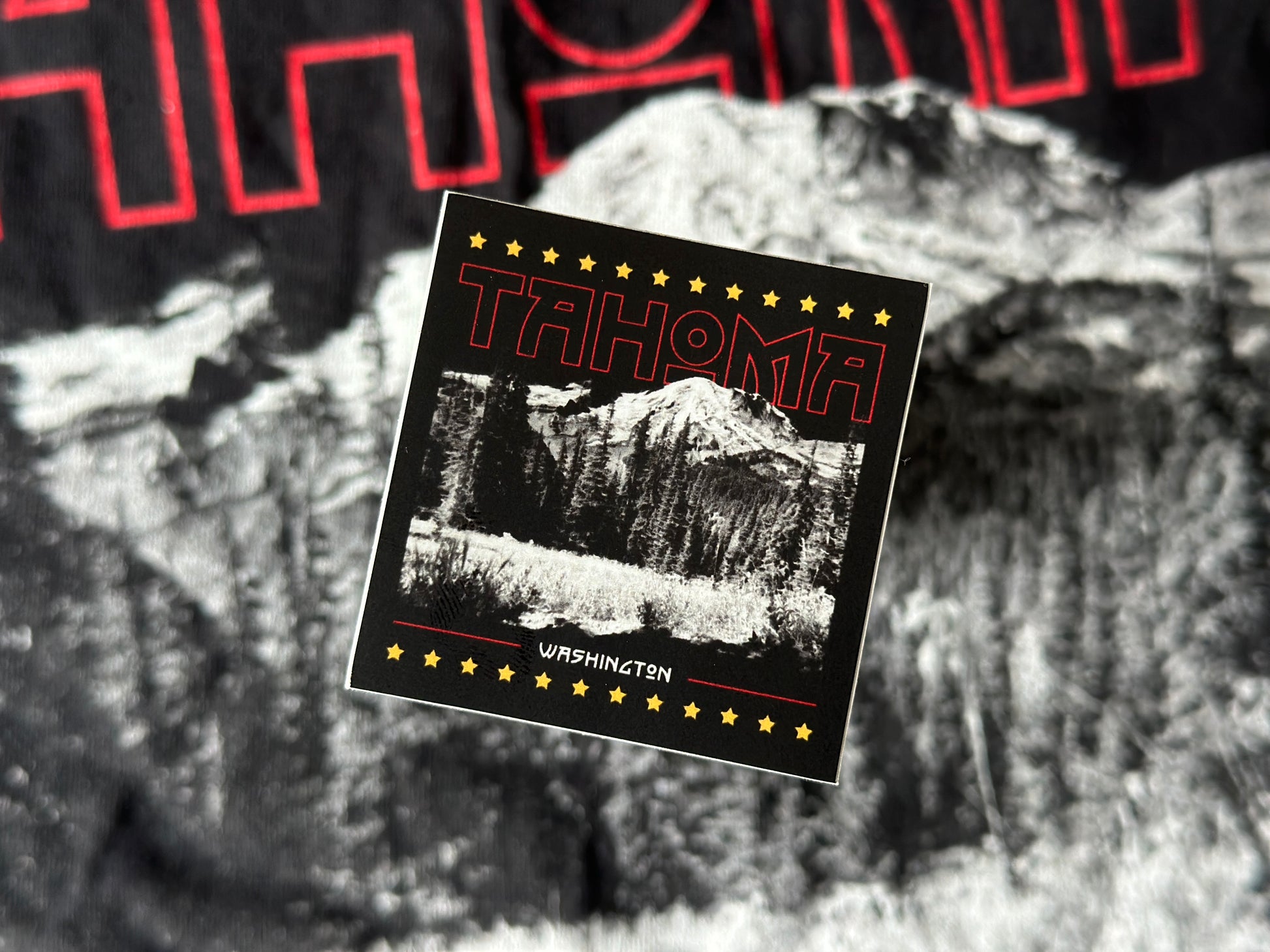 Inspired by classic rock band tour shirts, this design celebrates Tahoma and Mount Rainier National Park.