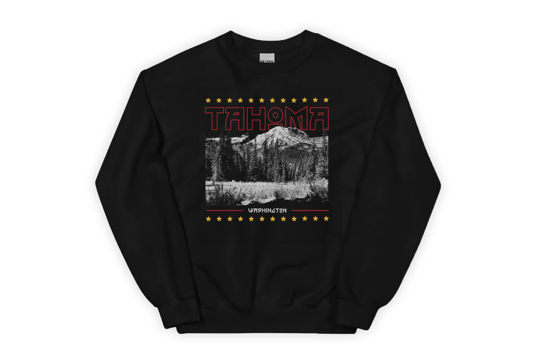 Inspired by classic rock band tour shirts, this crewneck celebrates Tahoma and the origins of Mount Rainier National Park.
