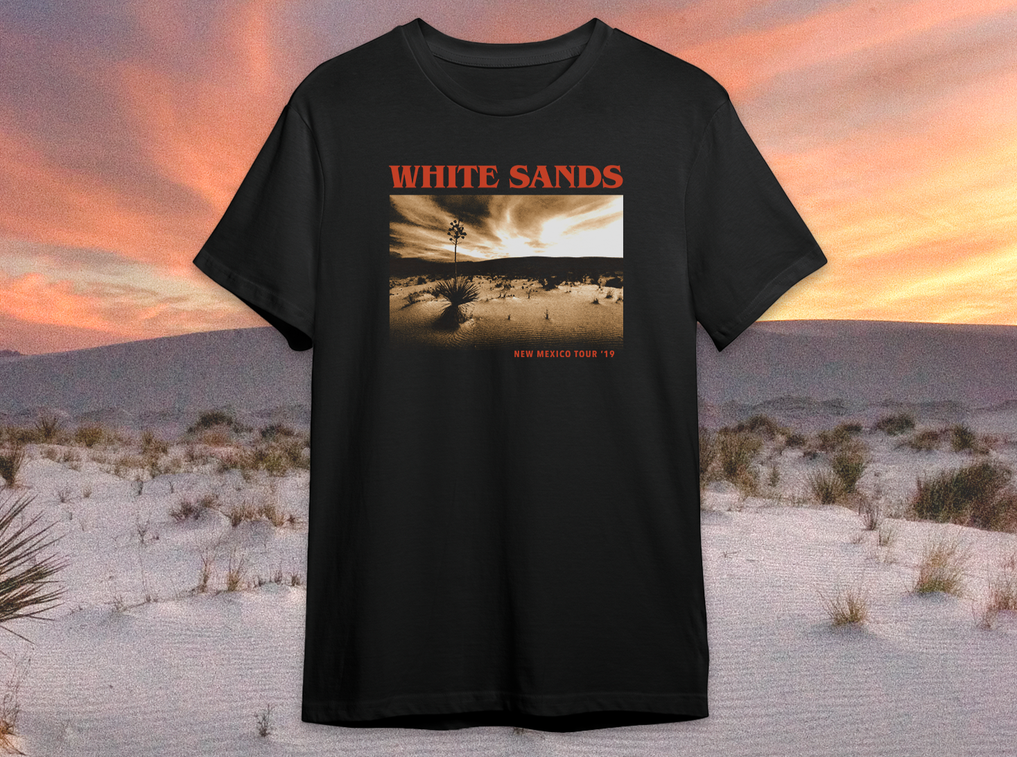 Inspired by classic rock band tour shirts, this national park themed band shirt celebrates the grandeur of White Sands National Park.