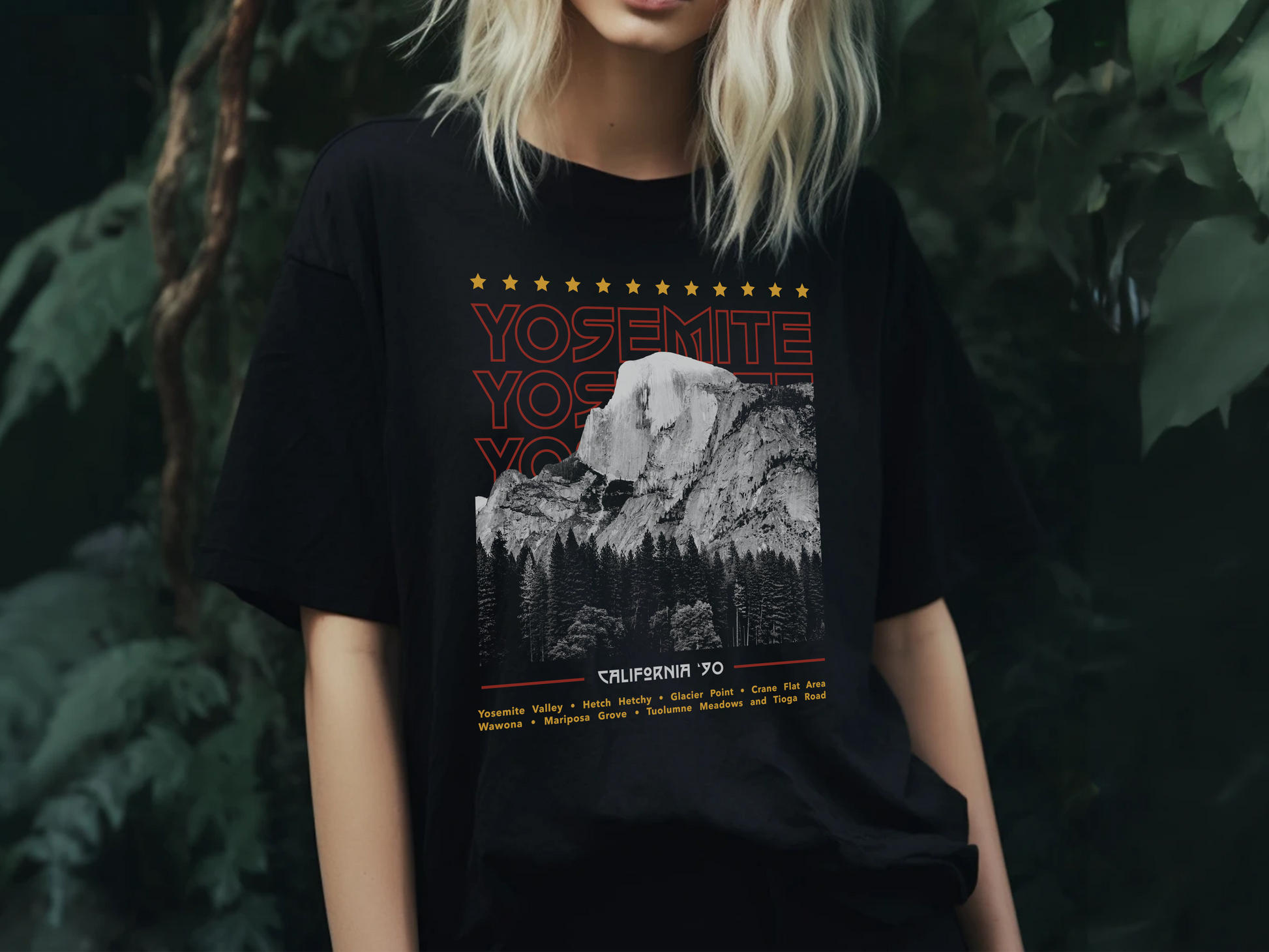 Inspired by classic rock band tour shirts, this national park themed band shirt celebrates the grandeur of Yosemite National Park.