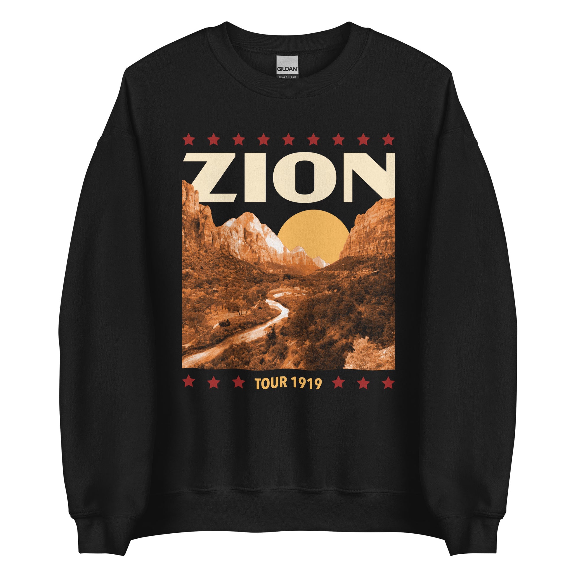 Inspired by classic rock band tour shirts, this national parks themed band crewneck celebrates the grandeur of Zion National Park.